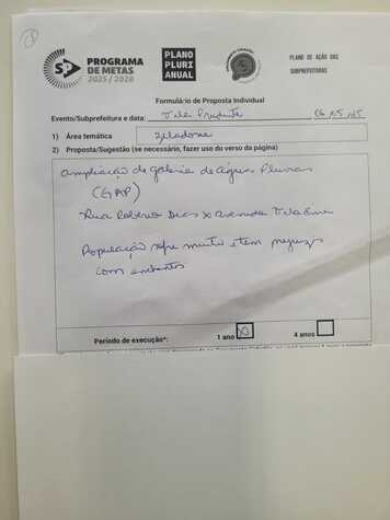 Proposta Individual - Audiência Pública na Subprefeitura Proposta Individual - Audiência Pública na Subprefeitura  •  07/05/2025  •  Vila Prudente  •  Código da proposta: 2164