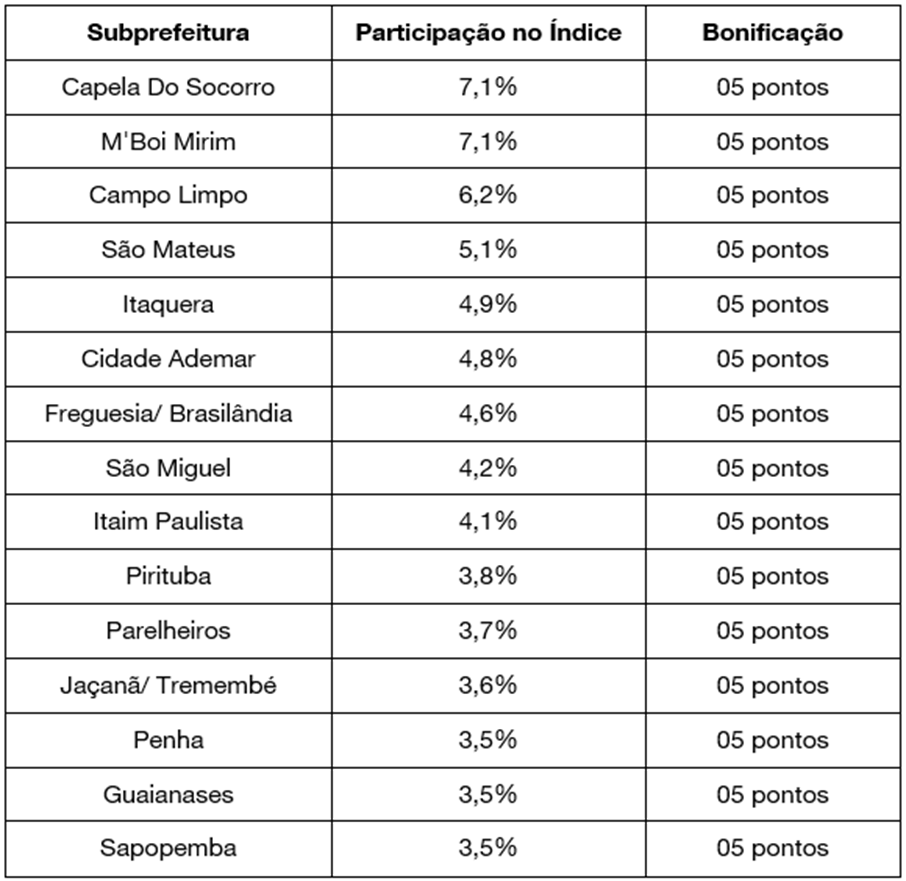 A subprefeituras que serão consideradas para essa bonificação apresentaram um índice de distribuição entre 3.5% e 7.1%, sendo elas: