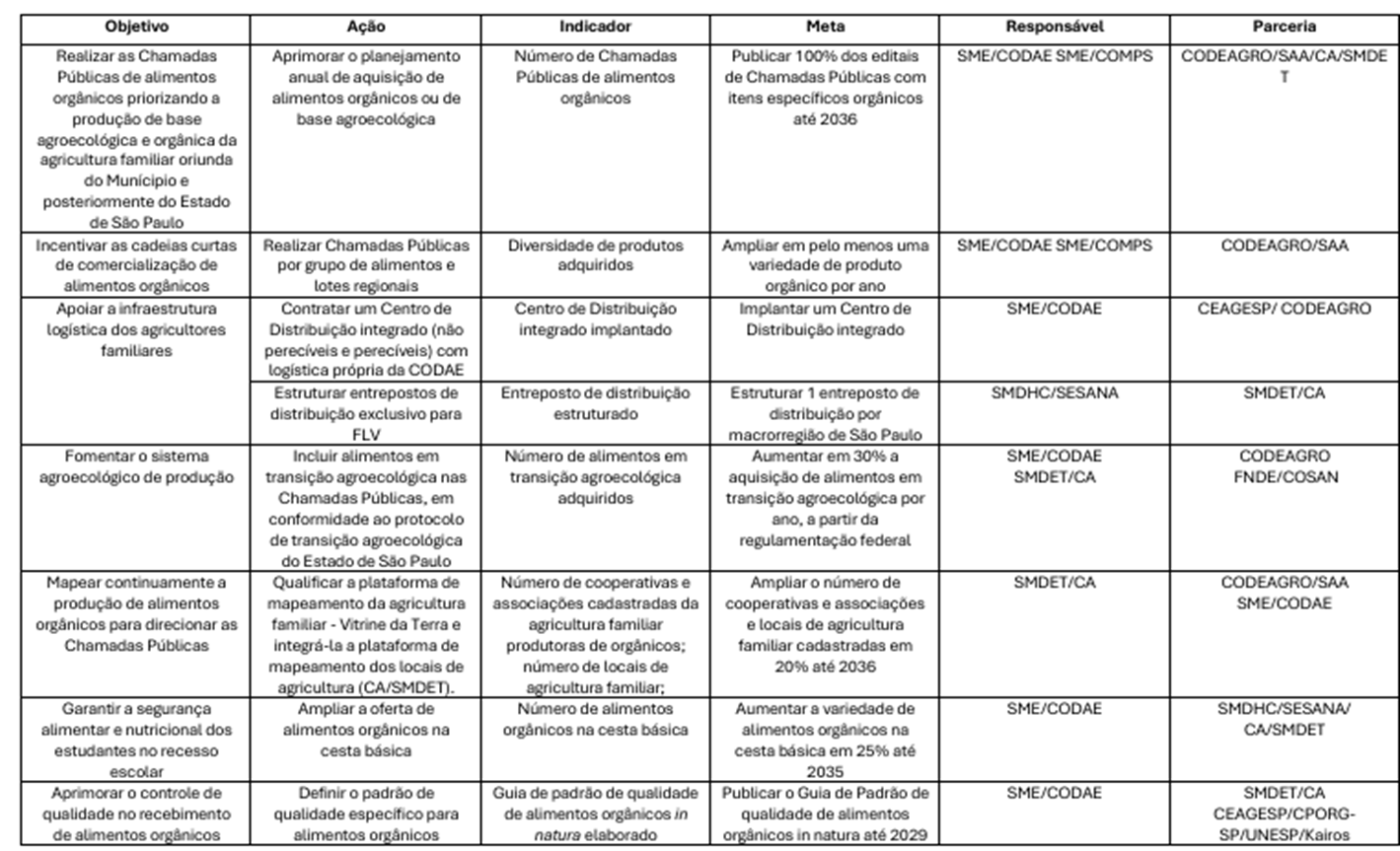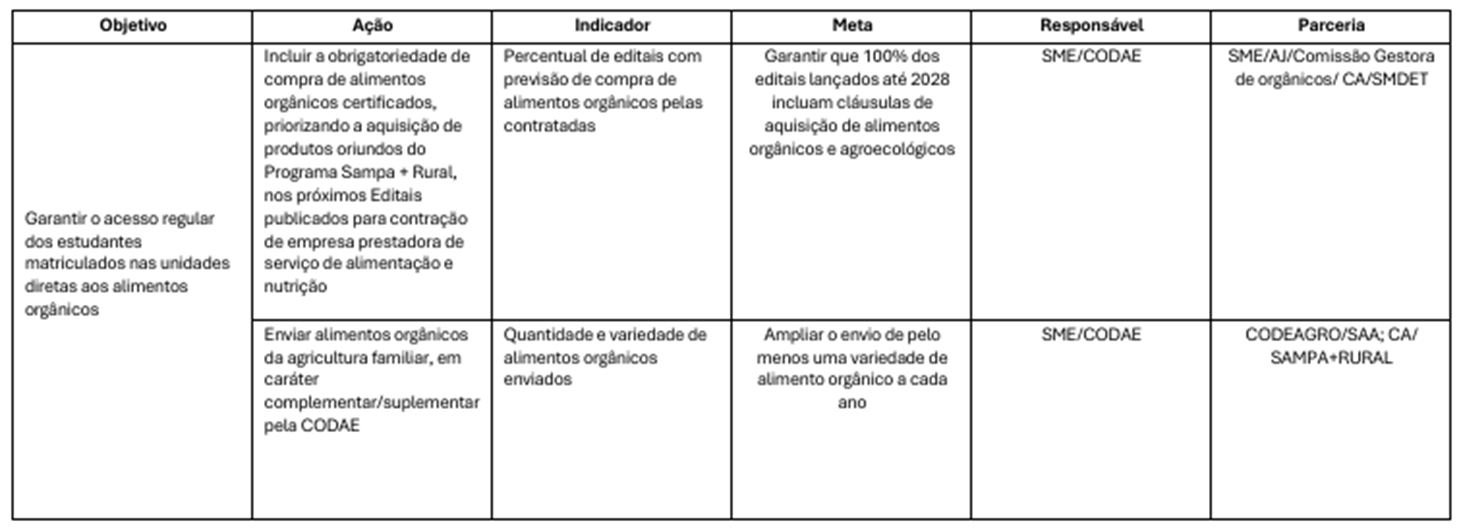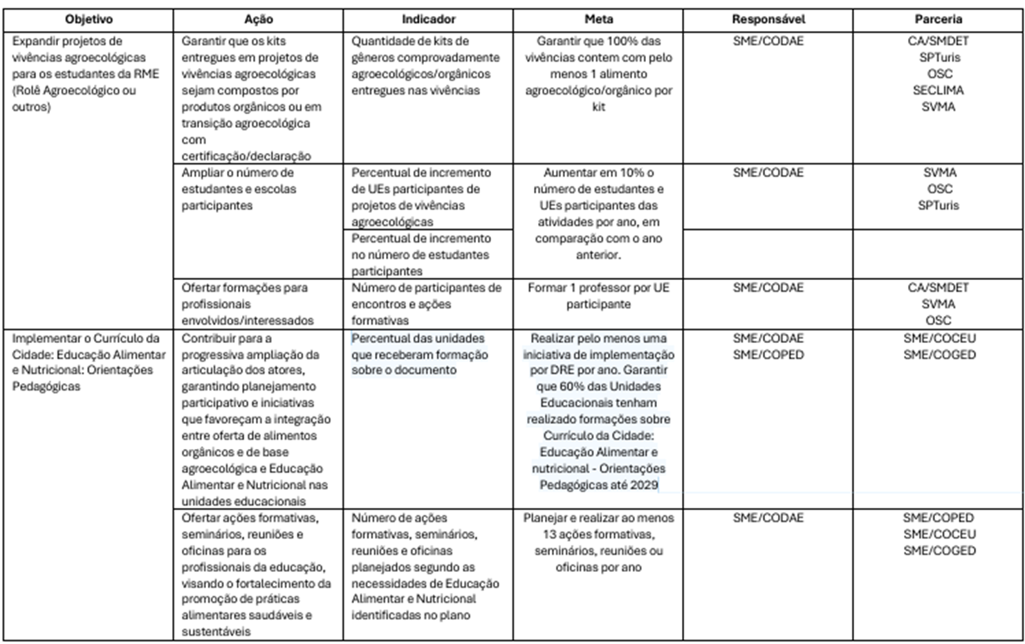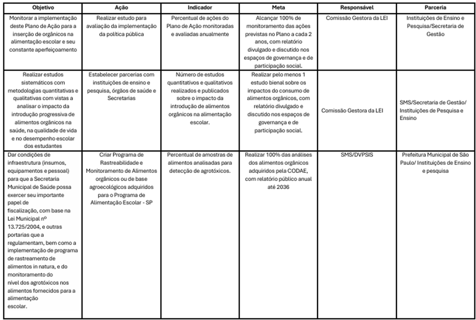 A presente proposta de repactuação do Plano de Ação, em atendimento ao artigo 10, § 1º da Lei Municipal nº 16.140/2015, que dispõe sobre a obrigatoriedade de inclusão de alimentos orgânicos ou de base agroecológica na alimentação escolar no âmbito da Rede Municipal de Ensino de São Paulo, prevê a continuidade da implantação da referida lei. Ressalta-se que o processo de construção do novo Plano de Ação está sendo participativo, a partir de proposta elaborada pela Coordenadoria de Alimentação Escolar (CODAE), órgão da Secretaria Municipal de Educação (SME) no primeiro semestre de 2025, em colaboração com a sociedade civil organizada e que será agora submetido à consulta pública pela plataforma da Prefeitura de São Paulo - Participe+.