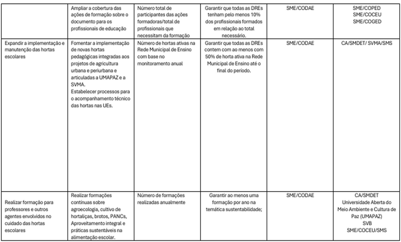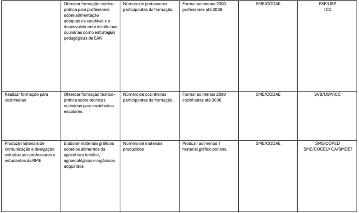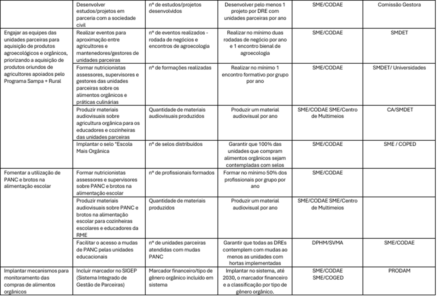 A presente proposta de repactuação do Plano de Ação, em atendimento ao artigo 10, § 1º da Lei Municipal nº 16.140/2015, que dispõe sobre a obrigatoriedade de inclusão de alimentos orgânicos ou de base agroecológica na alimentação escolar no âmbito da Rede Municipal de Ensino de São Paulo, prevê a continuidade da implantação da referida lei. Ressalta-se que o processo de construção do novo Plano de Ação está sendo participativo, a partir de proposta elaborada pela Coordenadoria de Alimentação Escolar (CODAE), órgão da Secretaria Municipal de Educação (SME) no primeiro semestre de 2025, em colaboração com a sociedade civil organizada e que será agora submetido à consulta pública pela plataforma da Prefeitura de São Paulo - Participe+.