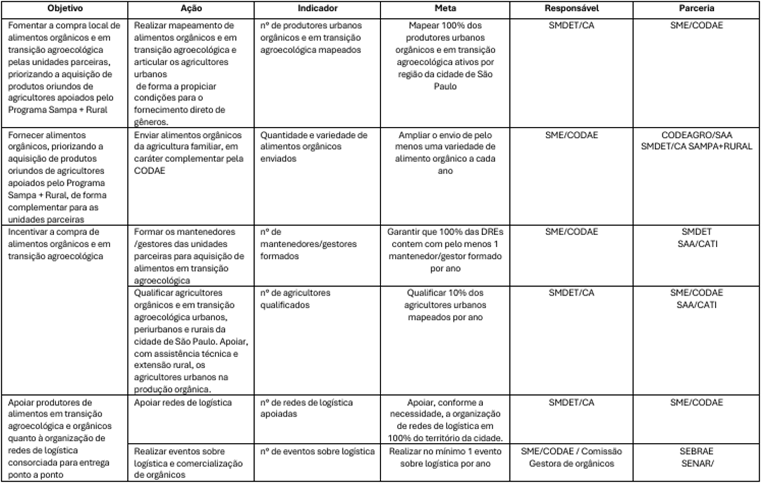 O presente Plano apresenta propostas de ações a serem desenvolvidas pela SME/CODAE em articulação com as Secretarias Municipais de Desenvolvimento Econômico e Trabalho, Gestão, Direitos Humanos, Saúde, Verde e Meio Ambiente e Estadual de Agricultura, além de instituições parceiras. Essas ações visam ampliar a presença de alimentos orgânicos na Alimentação Escolar, qualificar os processos logísticos, garantir o acesso de agricultores urbanos e periurbanos, fortalecer a agricultura familiar, implementar práticas de Educação Alimentar e Nutricional e assegurar o Direito Humano à Alimentação Adequada (DHAA), na perspectiva da Segurança Alimentar e Nutricional (SAN).